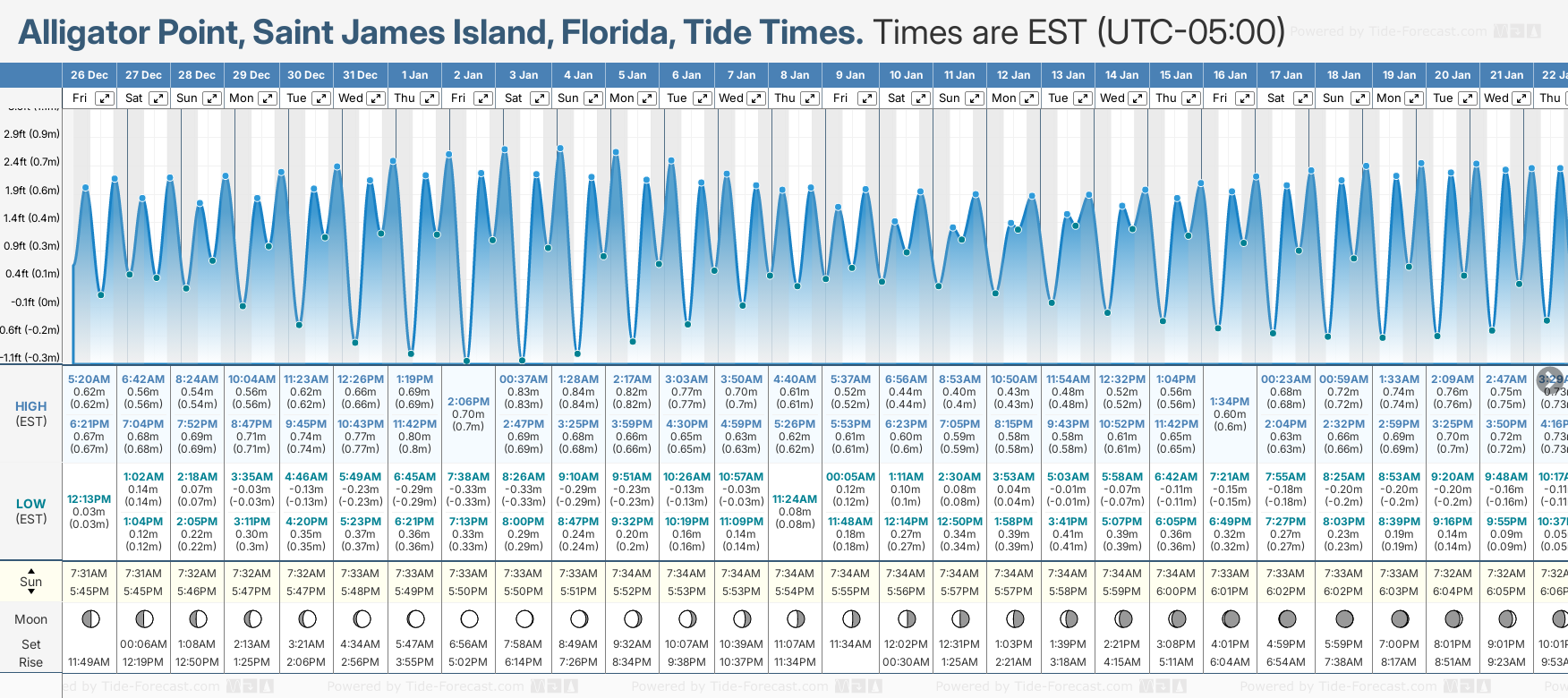 December and January Tide charts for Alligator Point, Saint James Island: The tide charts below show the height, time and date of high and low tides for the next 30 days.