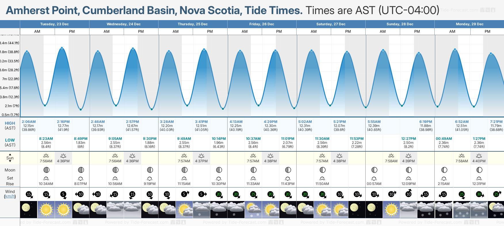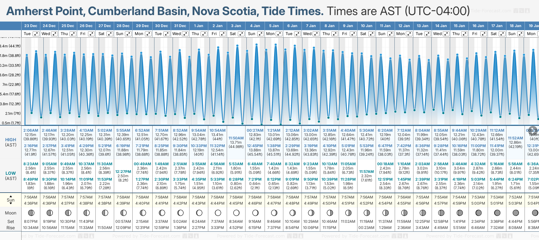 December and January Tide charts for Amherst Point, Cumberland Basin: The tide charts below show the height, time and date of high and low tides for the next 30 days.
