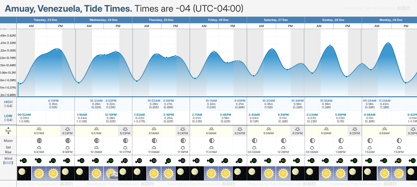 December and January Tide charts for Amuay: The tide charts below show the height, time and date of high and low tides for the next 30 days.