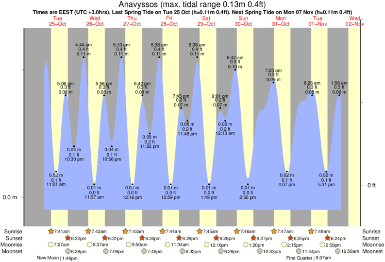 Tide Times are EET (UTC +2.0hrs). Last Spring High Tide at Anavyssos was on Fri 19 Dec (height: 0.11m 0.4ft). Next high Spring Tide at Anavyssos will be on Fri 02 Jan (height: 0.12m 0.4ft).