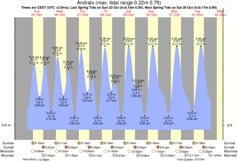 Tide Times are CET (UTC +1.0hrs). Last Spring High Tide at Andratx was on Sun 07 Dec (height: 0.21m 0.7ft). Next high Spring Tide at Andratx will be on Sun 21 Dec (height: 0.18m 0.6ft).