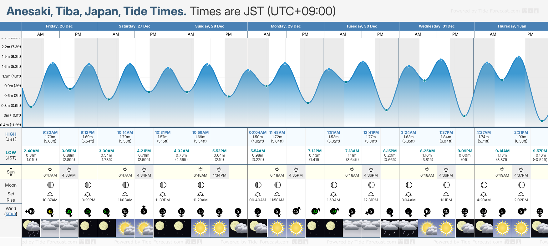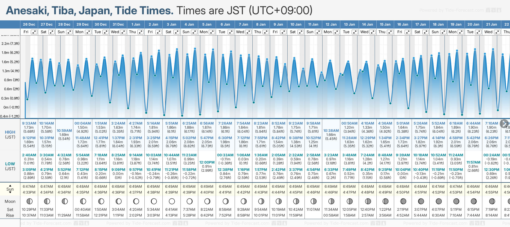 December and January Tide charts for Anesaki: The tide charts below show the height, time and date of high and low tides for the next 30 days.