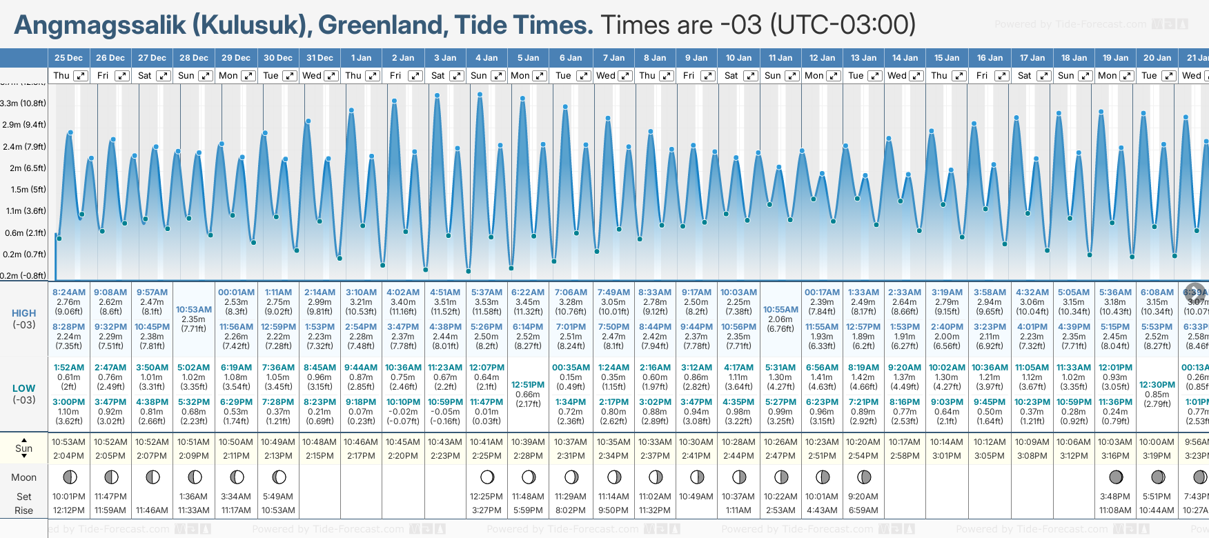 Tide Times are -03 (UTC -3.0hrs). Last Spring High Tide at Angmagssalik (Kulusuk) was on Sun 21 Dec (height: 3.10m 10.2ft). Next high Spring Tide at Angmagssalik (Kulusuk) will be on Sun 04 Jan (height: 3.53m 11.6ft).