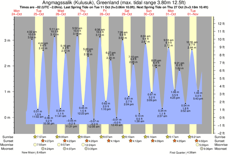 December and January Tide charts for Angmagssalik (Kulusuk): The tide charts below show the height, time and date of high and low tides for the next 30 days.