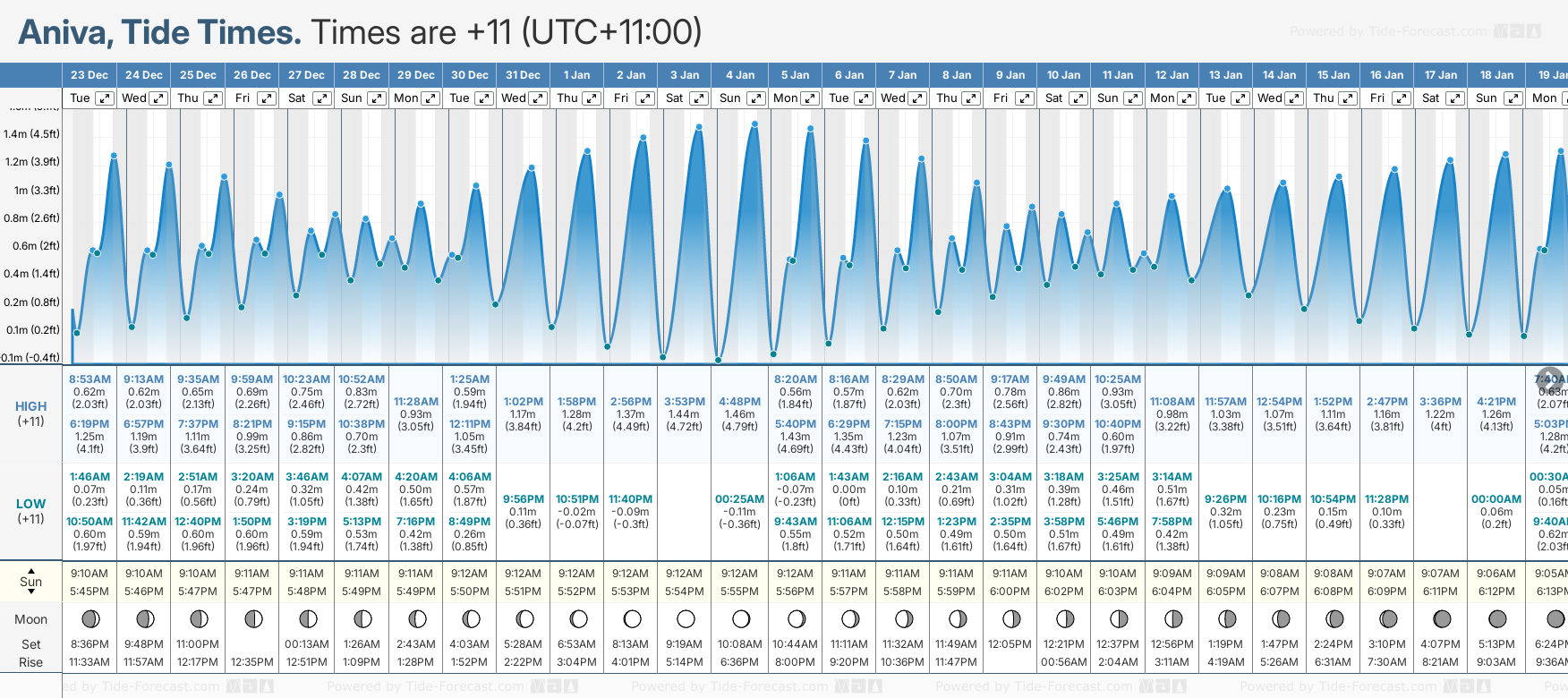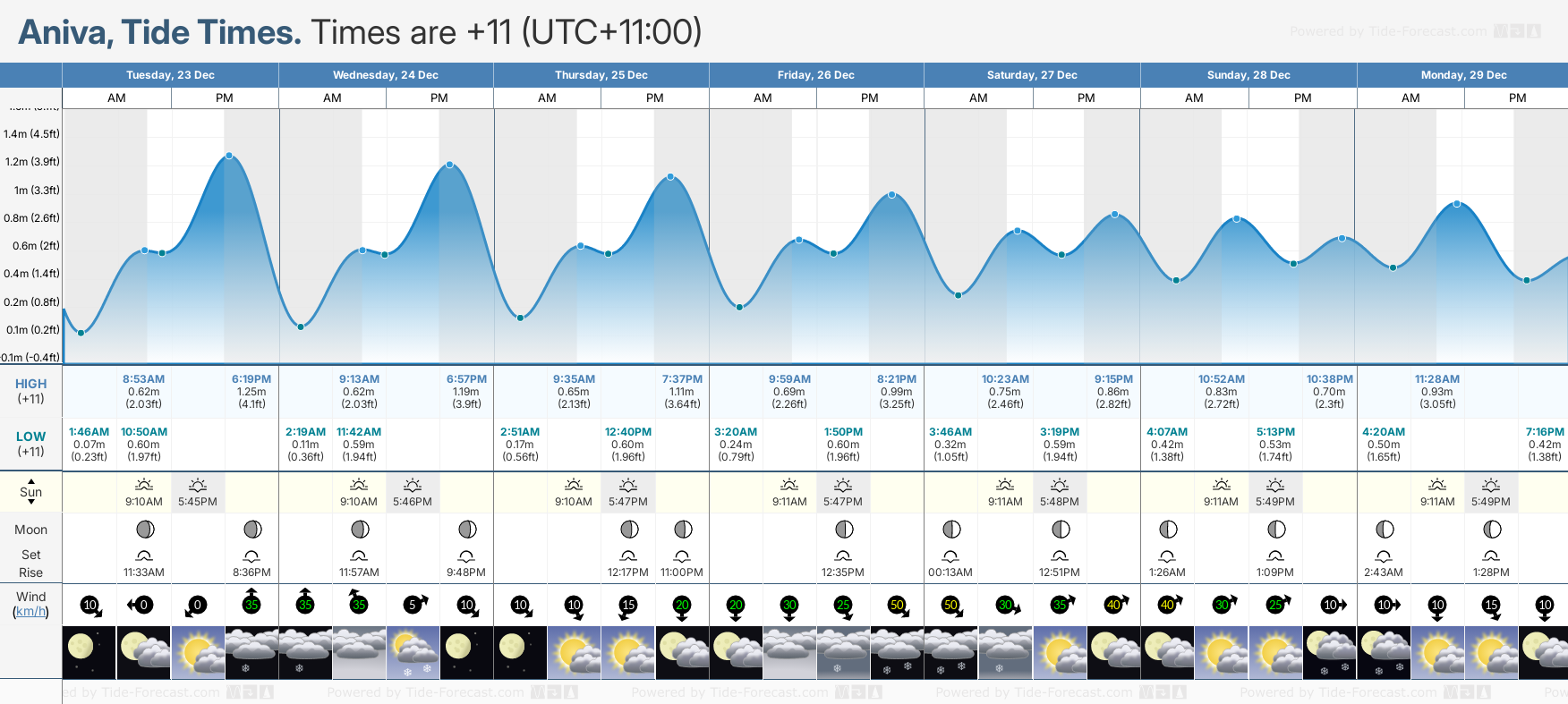 December and January Tide charts for Aniva: The tide charts below show the height, time and date of high and low tides for the next 30 days.
