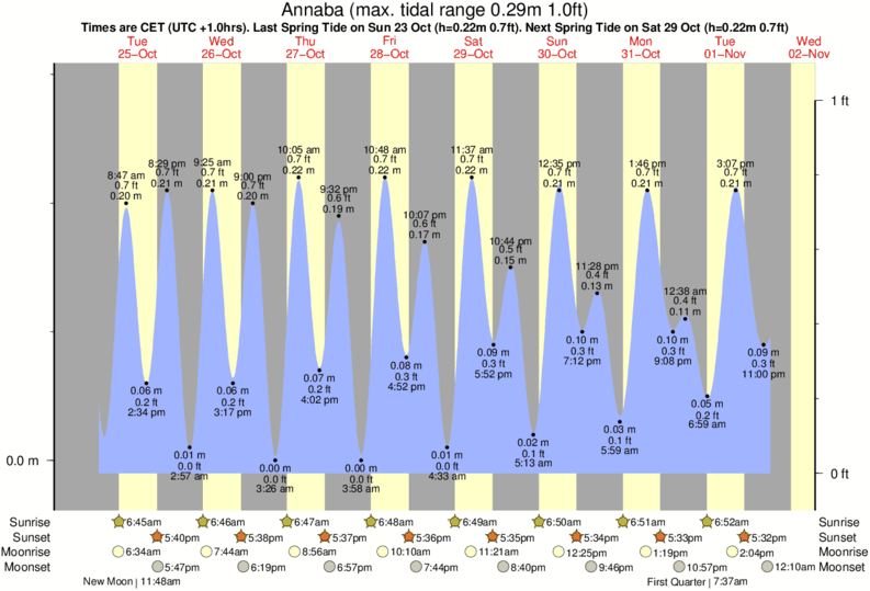 Tide Times are CET (UTC +1.0hrs). Last Spring High Tide at Annaba was on Mon 08 Dec (height: 0.26m 0.9ft). Next high Spring Tide at Annaba will be on Mon 22 Dec (height: 0.24m 0.8ft).