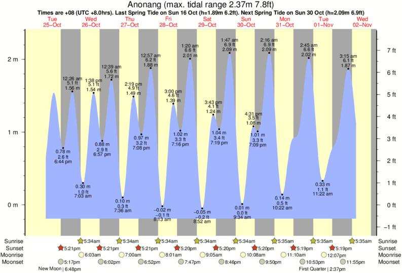 Tide Times are PST (UTC +8.0hrs). Last Spring High Tide at Anonang was on Mon 08 Dec (height: 2.14m 7.0ft). Next high Spring Tide at Anonang will be on Wed 24 Dec (height: 1.90m 6.2ft).