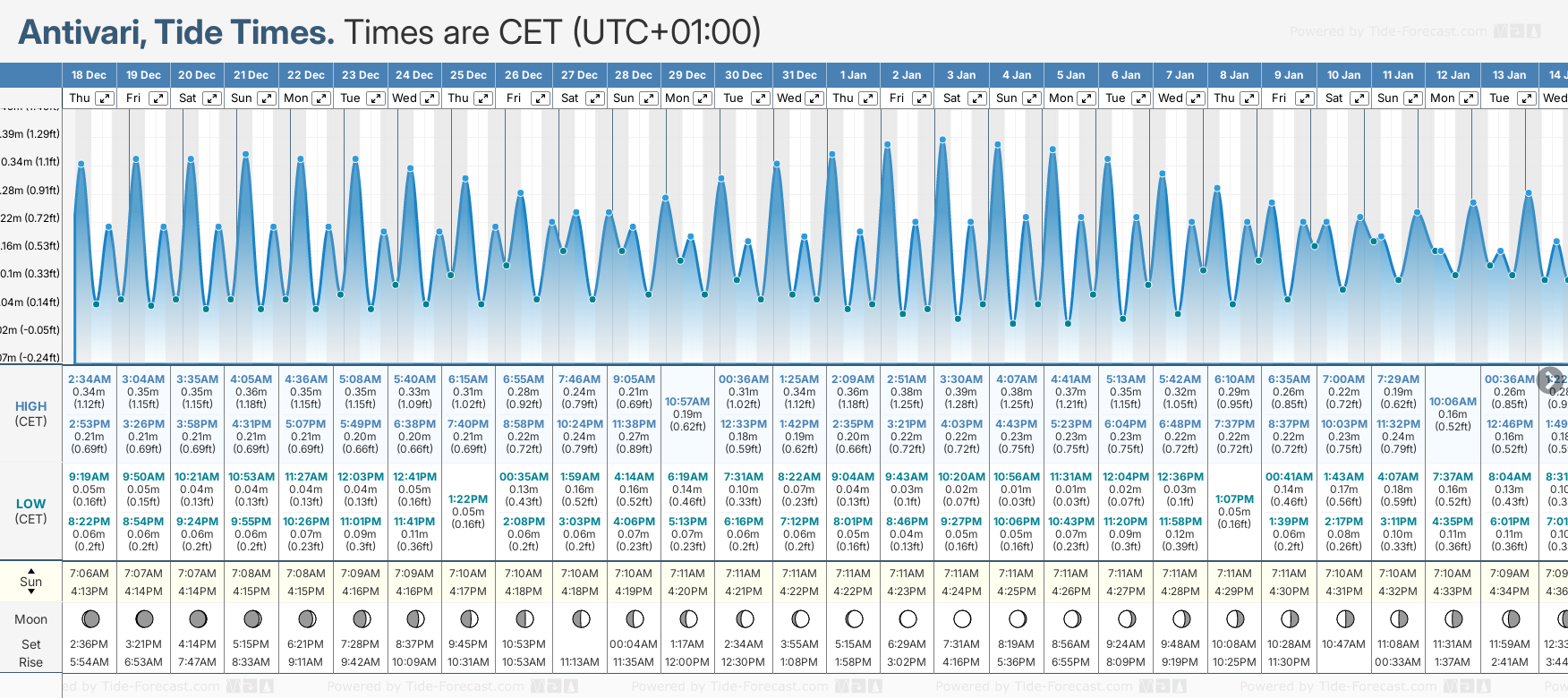 December and January Tide charts for Antivari: The tide charts below show the height, time and date of high and low tides for the next 30 days.
