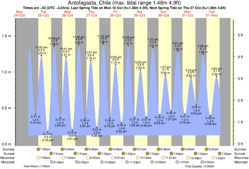 Tide Times are -04 (UTC -3.0hrs). Last Spring High Tide at Antofagasta was on Sat 20 Dec (height: 1.40m 4.6ft). Next high Spring Tide at Antofagasta will be on Sat 03 Jan (height: 1.59m 5.2ft).
