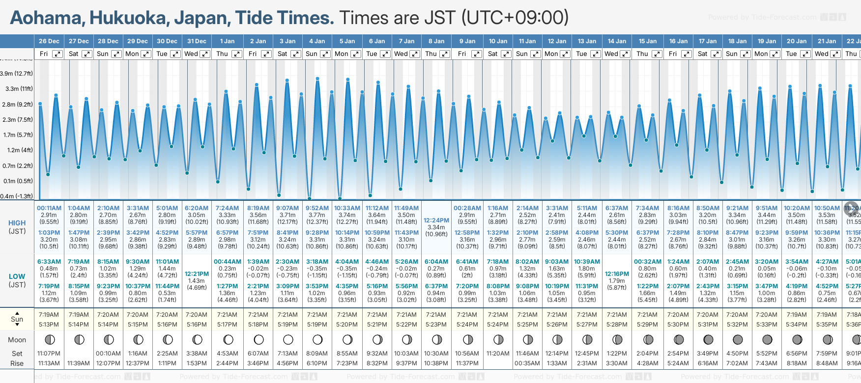 Tide Times are JST (UTC +9.0hrs). Last Spring High Tide at Aohama was on Mon 22 Dec (height: 3.43m 11.3ft). Next high Spring Tide at Aohama will be on Sun 04 Jan (height: 3.77m 12.4ft).