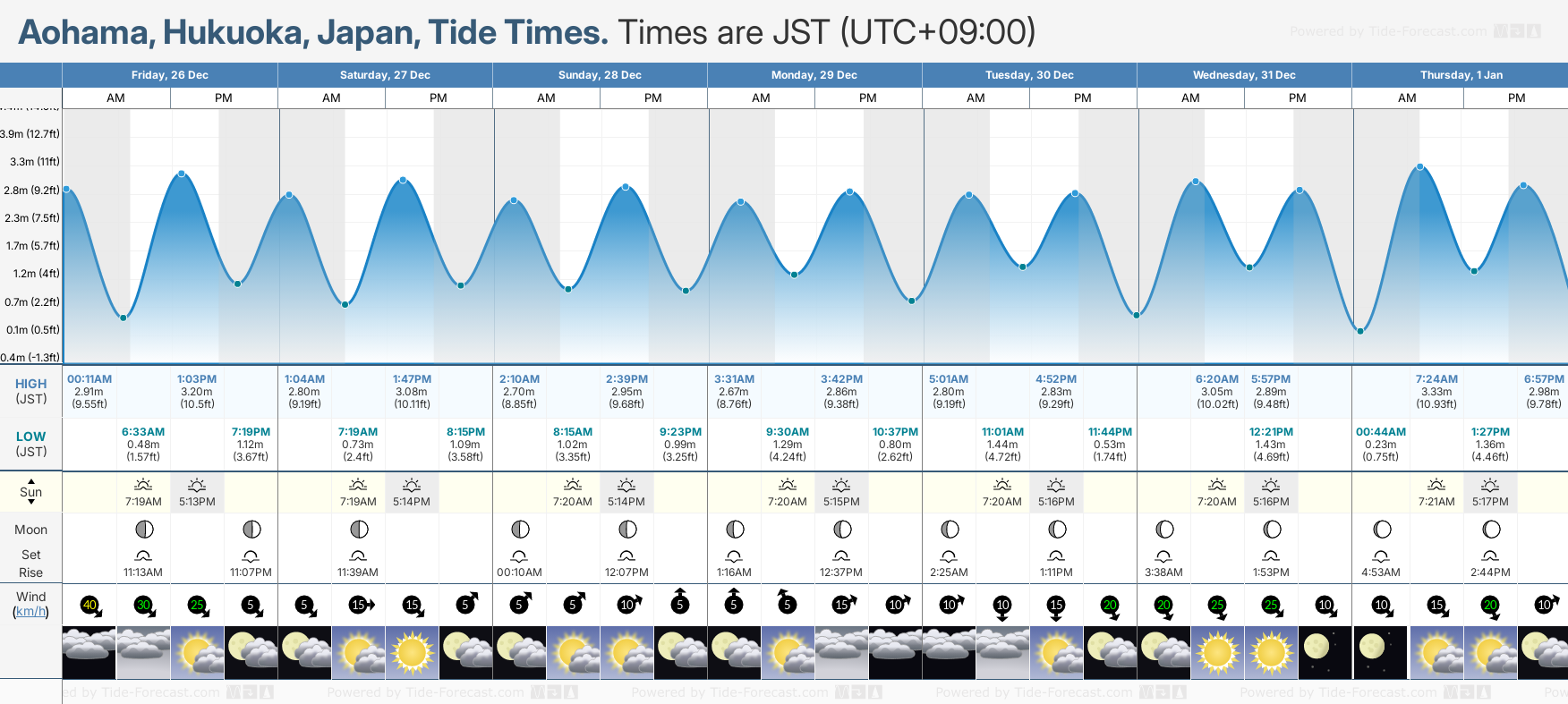 December and January Tide charts for Aohama: The tide charts below show the height, time and date of high and low tides for the next 30 days.