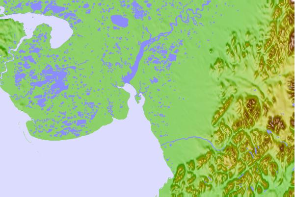 Use this relief map to navigate to tide stations, surf breaks and cities that are in the area of Apokak Creek entrance, Alaska.