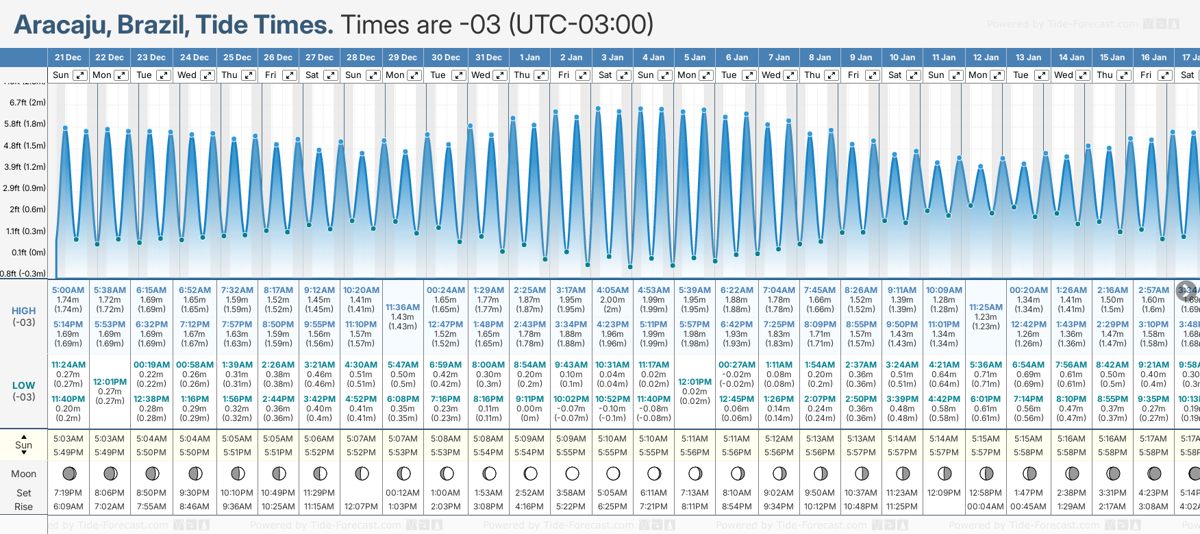 December and January Tide charts for Aracaju: The tide charts below show the height, time and date of high and low tides for the next 30 days.
