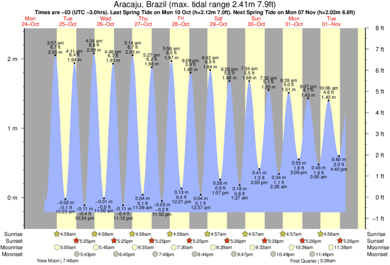 Aracaju tide chart key: The tide chart above shows the height and times of high tide and low tide for Aracaju, Brazil. The grey shading corresponds to nighttime hours between sunset and sunrise at Aracaju.