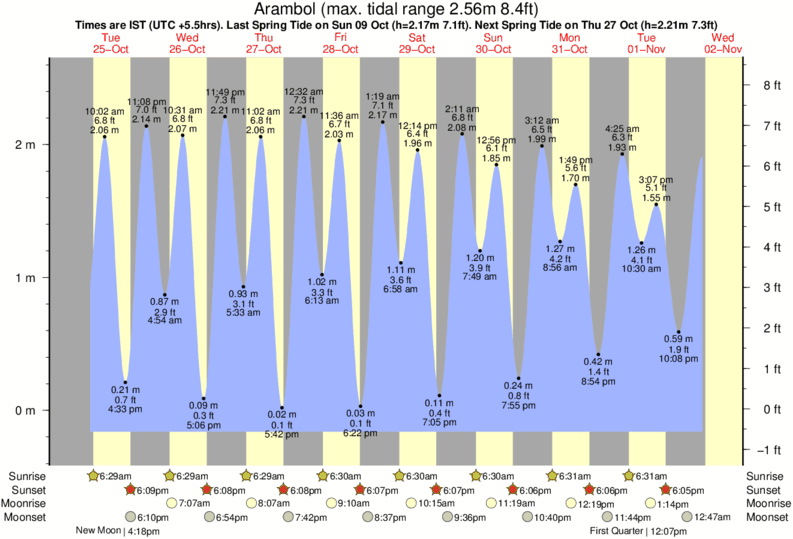 Tide Times are IST (UTC +5.5hrs). Last Spring High Tide at Arambol was on Sat 06 Dec (height: 2.34m 7.7ft). Next high Spring Tide at Arambol will be on Tue 23 Dec (height: 2.12m 7.0ft).