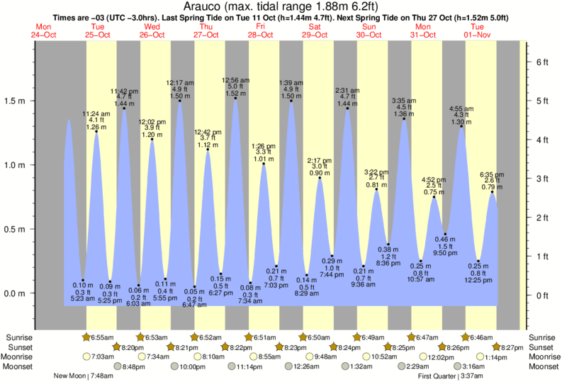 Tide Times are -04 (UTC -3.0hrs). Last Spring High Tide at Arauco was on Fri 05 Dec (height: 1.74m 5.7ft). Next high Spring Tide at Arauco will be on Sat 20 Dec (height: 1.47m 4.8ft).
