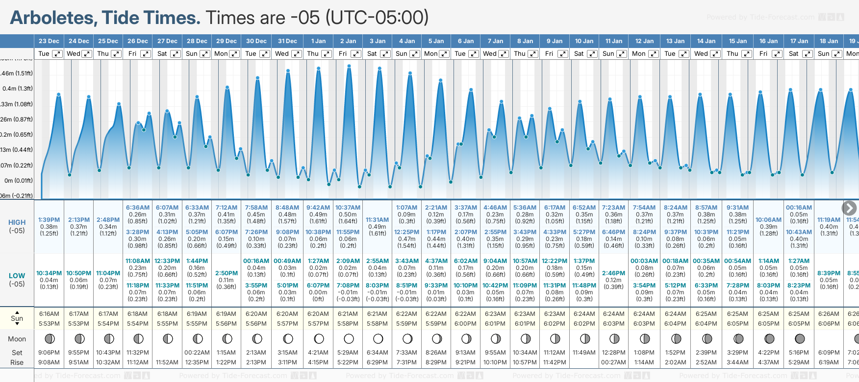 December and January Tide charts for Arboletes: The tide charts below show the height, time and date of high and low tides for the next 30 days.