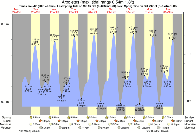 Tide Times are -05 (UTC -5.0hrs). Last Spring High Tide at Arboletes was on Fri 19 Dec (height: 0.39m 1.3ft). Next high Spring Tide at Arboletes will be on Fri 02 Jan (height: 0.50m 1.6ft).