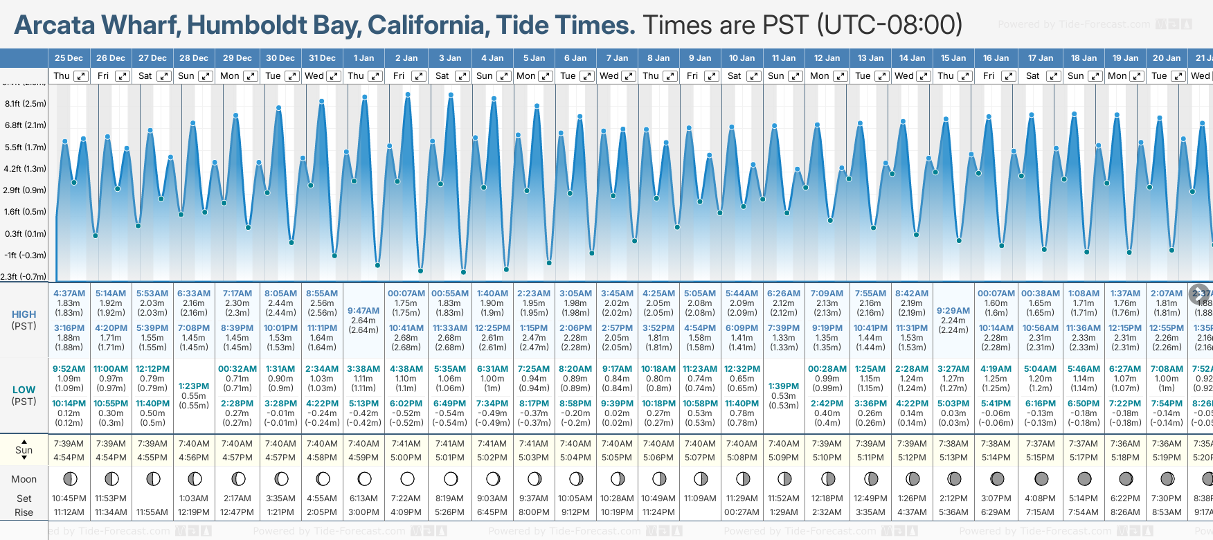 Tide chart for ArcataShowing low and high tide times for the next 30 days at Arcata. Tide Times are PST (UTC -8.0hrs).