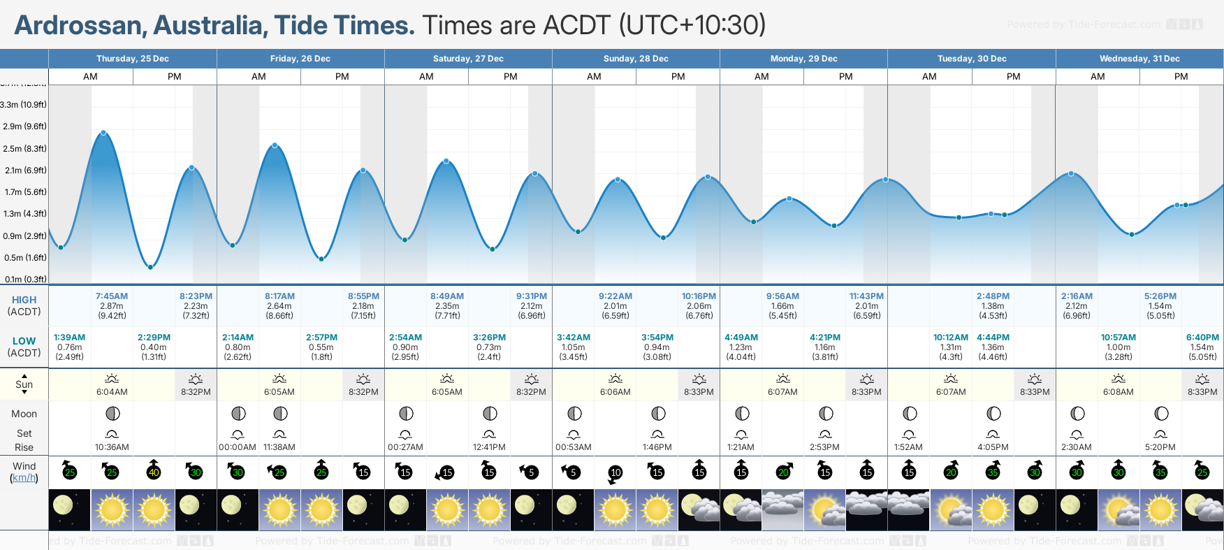 Tide chart for ArdrossanShowing low and high tide times for the next 30 days at Ardrossan. Tide Times are ACDT (UTC +10.5hrs).