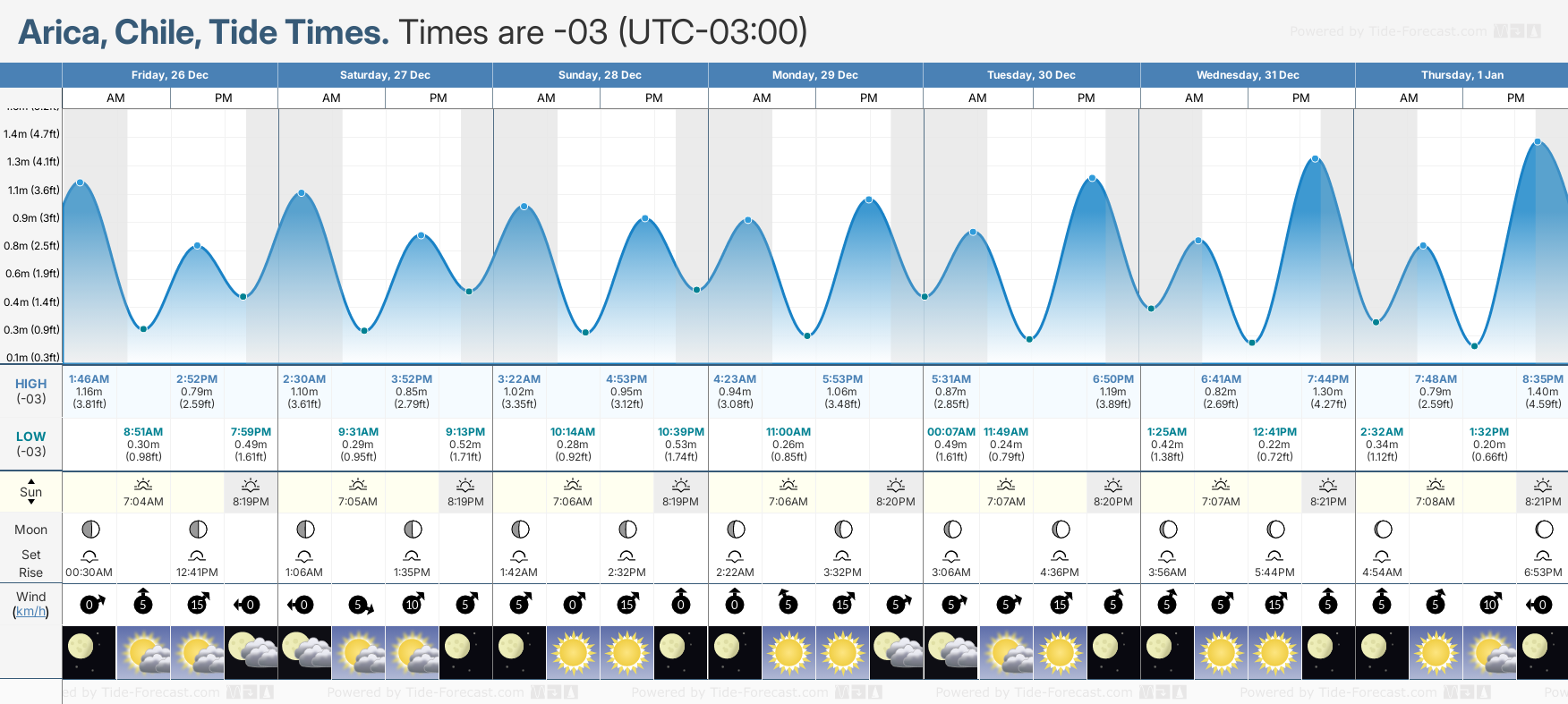December and January Tide charts for Arica: The tide charts below show the height, time and date of high and low tides for the next 30 days.