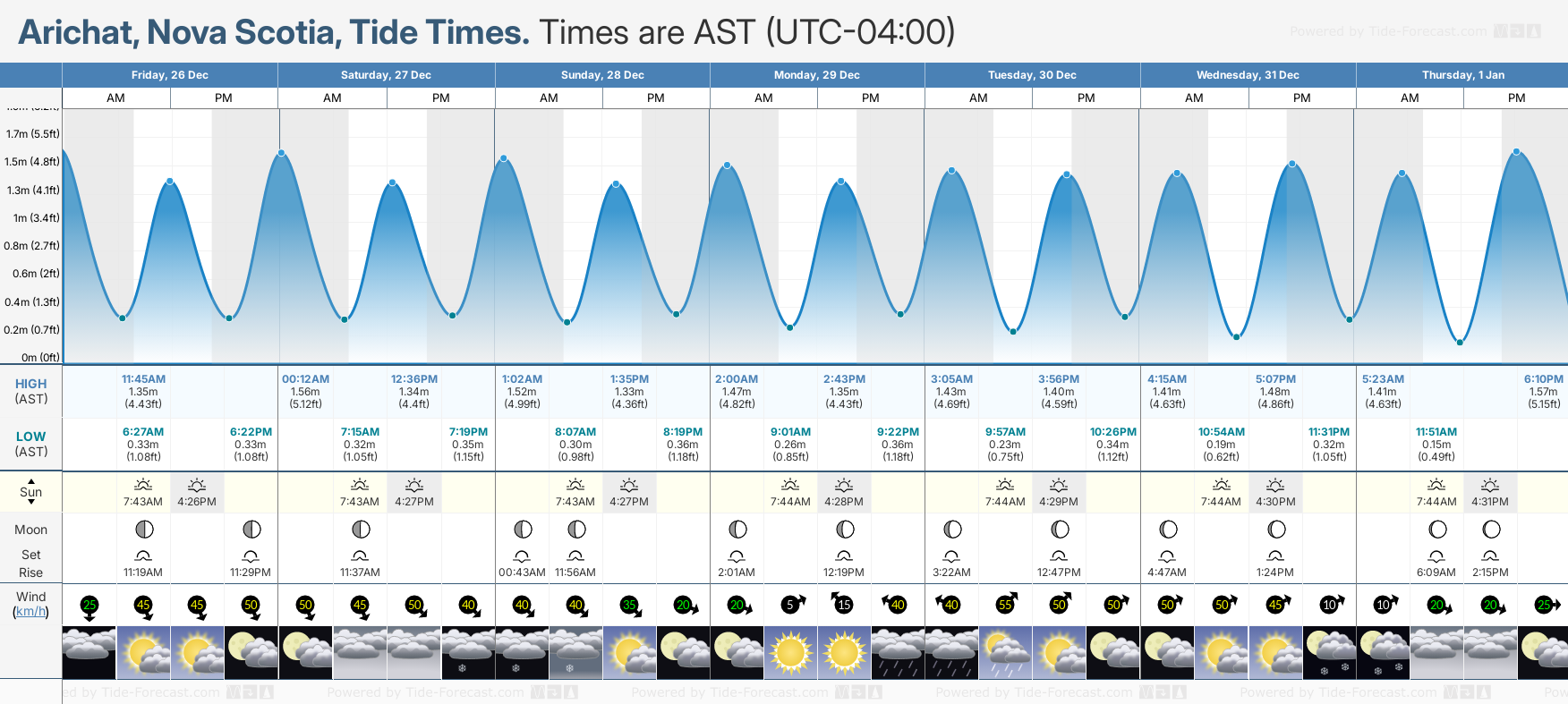 December and January Tide charts for Arichat: The tide charts below show the height, time and date of high and low tides for the next 30 days.