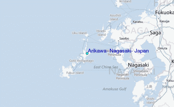 Use this relief map to navigate to tide stations, surf breaks and cities that are in the area of Arikawa, Nagasaki, Japan.