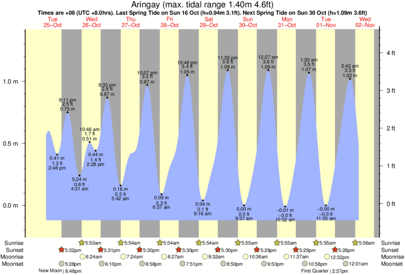 Tide Times are PST (UTC +8.0hrs). Last Spring High Tide at Aringay was on Sun 07 Dec (height: 1.28m 4.2ft). Next high Spring Tide at Aringay will be on Mon 22 Dec (height: 1.10m 3.6ft).