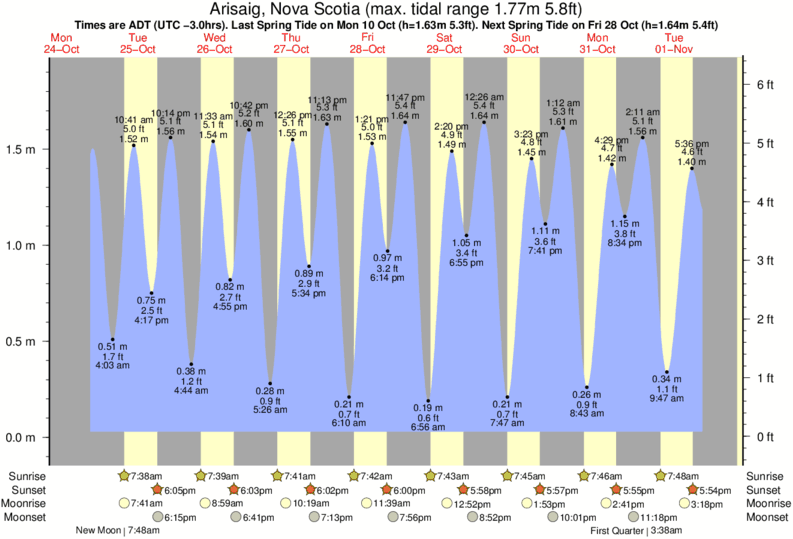 Tide Times are AST (UTC -4.0hrs). Last Spring High Tide at Arisaig was on Sat 06 Dec (height: 1.76m 5.8ft). Next high Spring Tide at Arisaig will be on Sun 21 Dec (height: 1.61m 5.3ft).