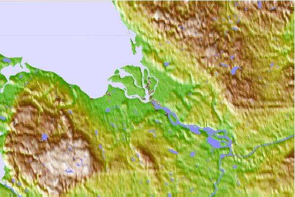 Use this relief map to navigate to tide stations, surf breaks and cities that are in the area of Arkhangel'sk, Russia.
