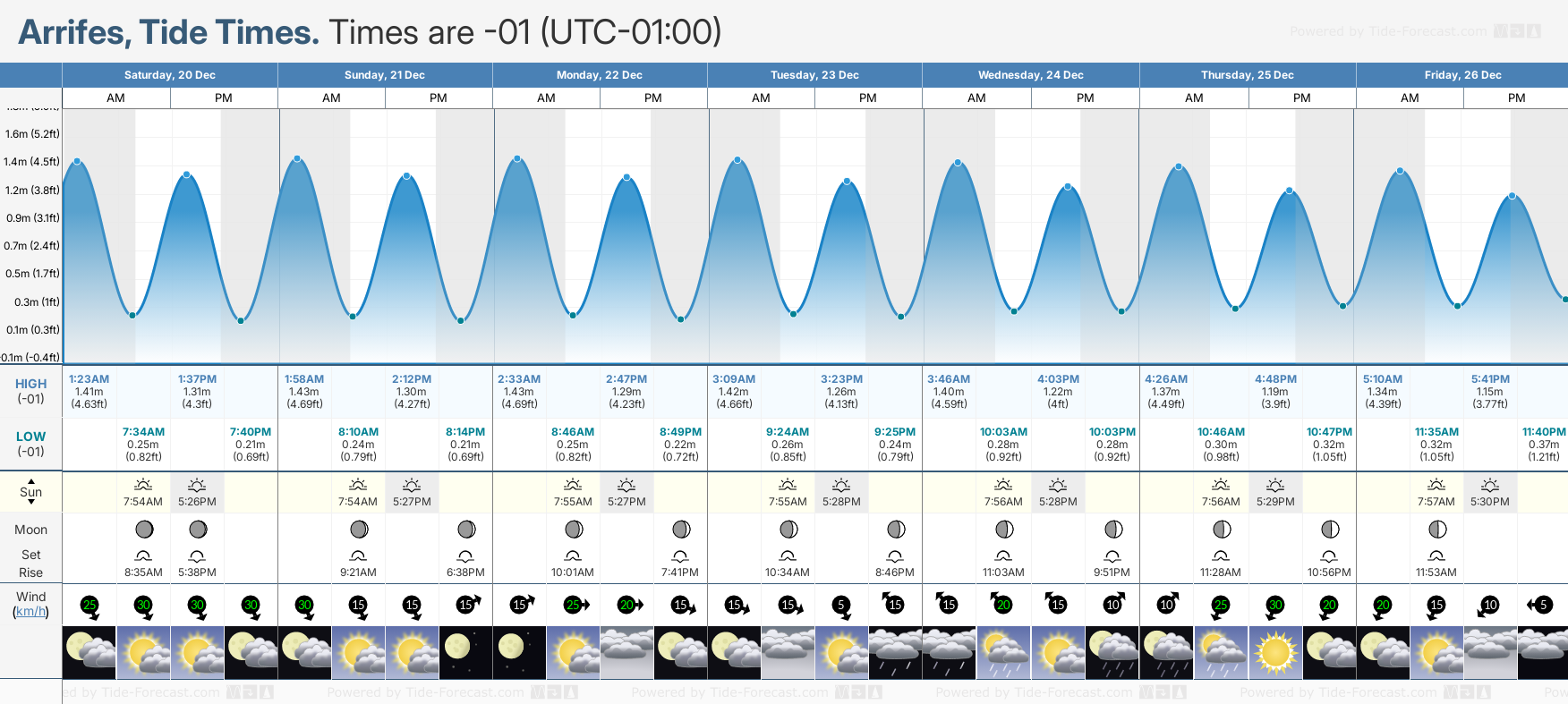 Tide Times are -01 (UTC -1.0hrs). Last Spring High Tide at Arrifes was on Sat 06 Dec (height: 1.64m 5.4ft). Next high Spring Tide at Arrifes will be on Sun 21 Dec (height: 1.43m 4.7ft).