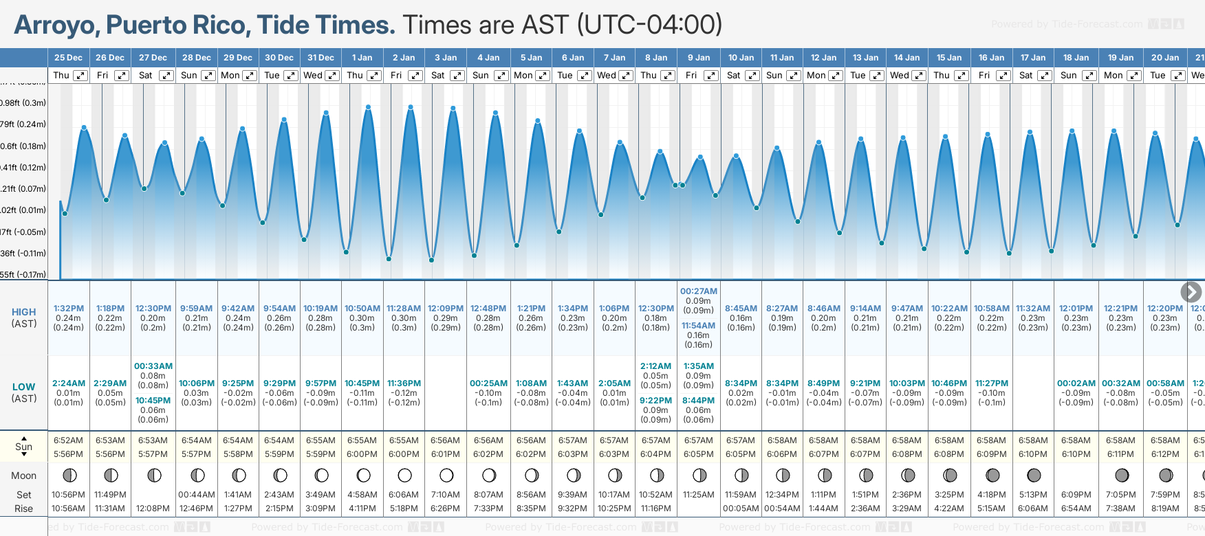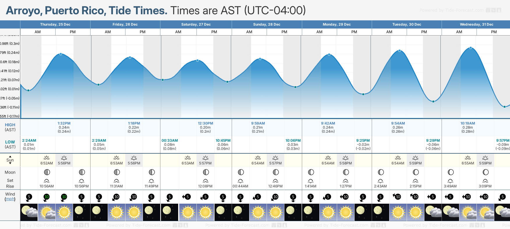 Tide Times are AST (UTC -4.0hrs). Last Spring High Tide at Arroyo was on Mon 22 Dec (height: 0.27m 0.9ft). Next high Spring Tide at Arroyo will be on Thu 01 Jan (height: 0.30m 1.0ft).