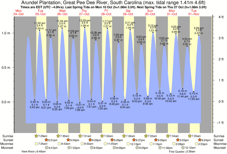 Tide Times are EST (UTC -5.0hrs). Last Spring High Tide at Arundel Plantation, Great Pee Dee River was on Fri 19 Dec (height: 0.90m 3.0ft). Next high Spring Tide at Arundel Plantation, Great Pee Dee River will be on Sat 03 Jan (height: 1.02m 3.3ft).