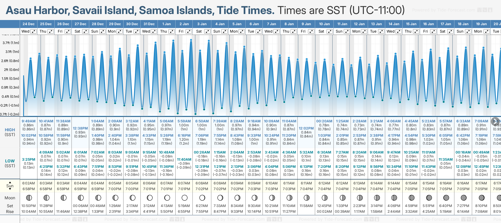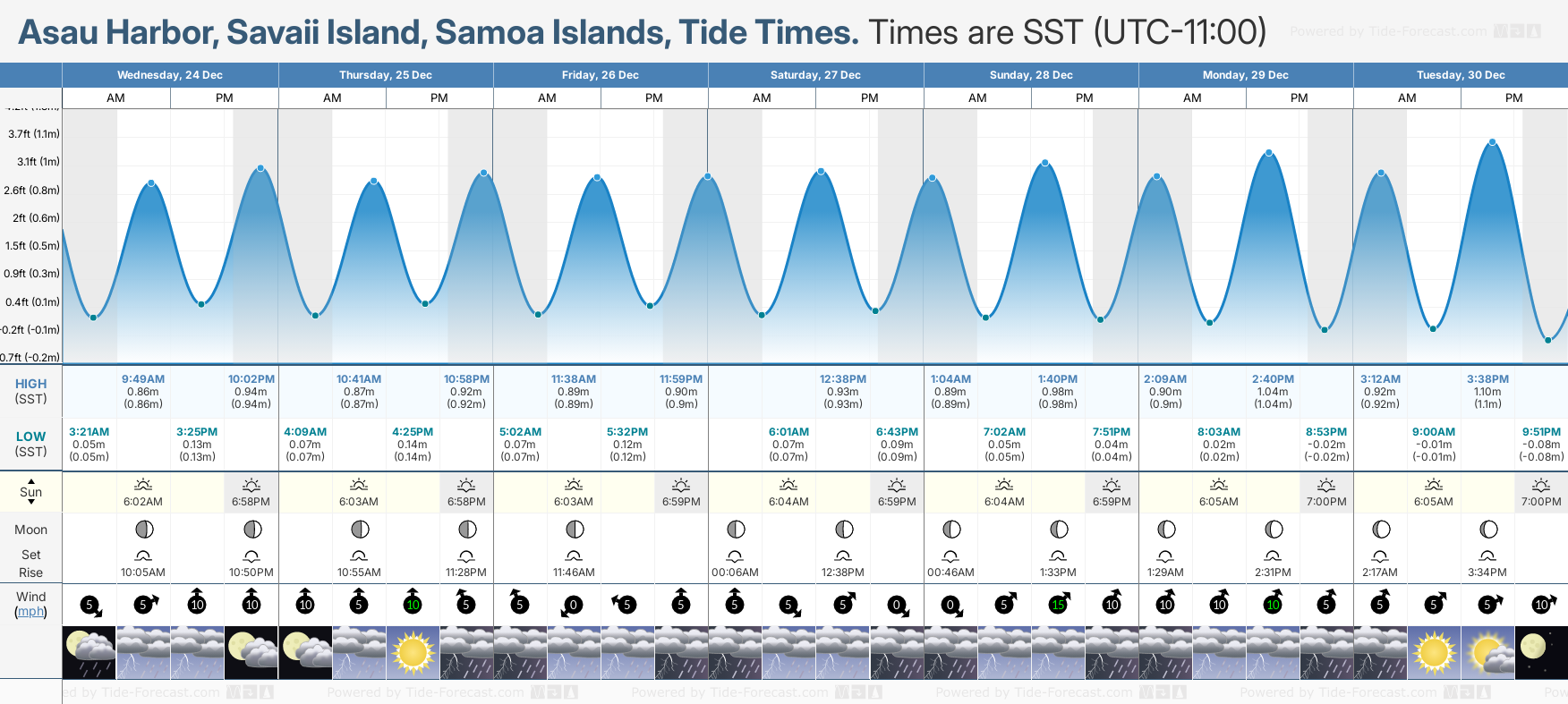 December and January Tide charts for Asau Harbor, Savaii Island: The tide charts below show the height, time and date of high and low tides for the next 30 days.