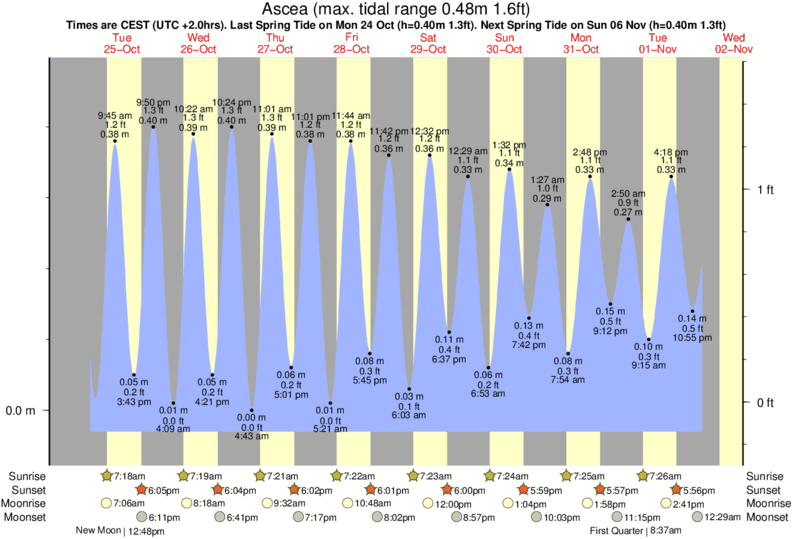 Tide Times are CET (UTC +1.0hrs). Last Spring High Tide at Ascea was on Sun 07 Dec (height: 0.41m 1.3ft). Next high Spring Tide at Ascea will be on Sun 21 Dec (height: 0.37m 1.2ft).
