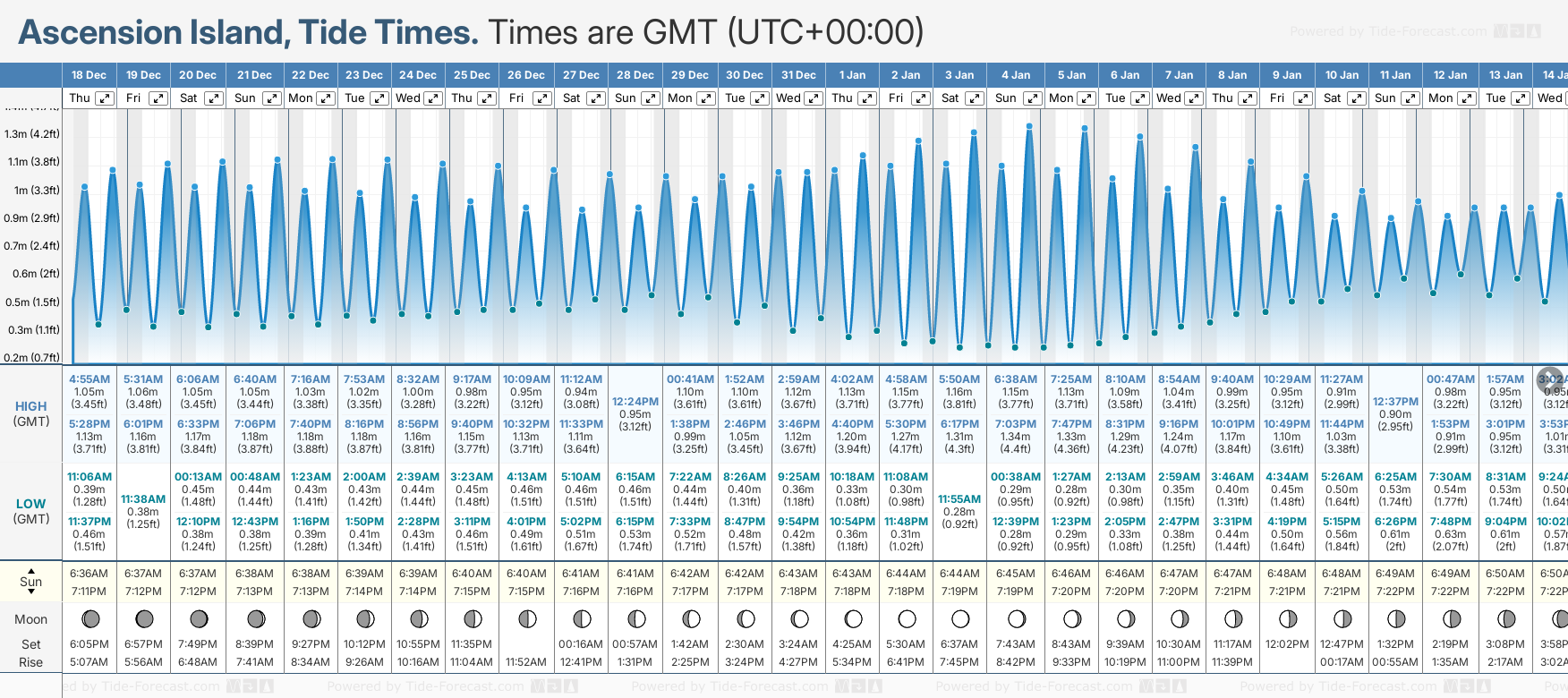 December and January Tide charts for Ascension Island: The tide charts below show the height, time and date of high and low tides for the next 30 days.