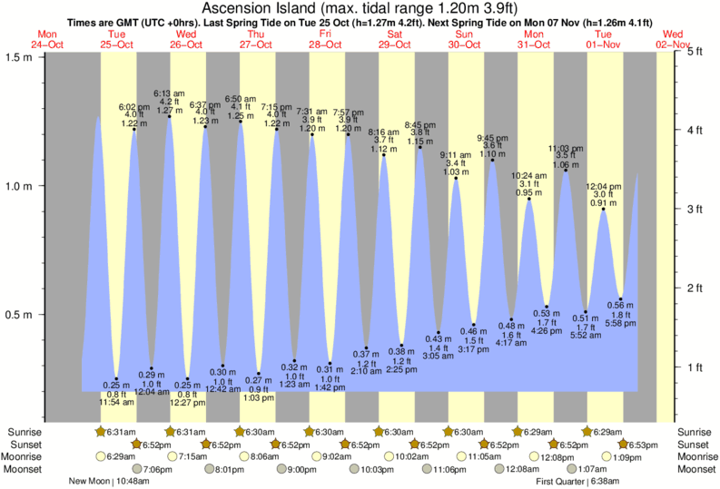 Tide chart for Ascension IslandShowing low and high tide times for the next 30 days at Ascension Island. Tide Times are GMT (UTC +0hrs).