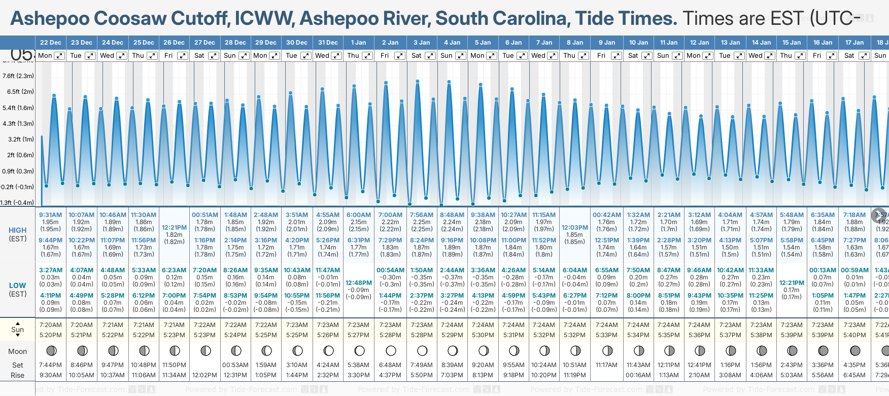 Ashepoo Coosaw Cutoff, ICWW, Ashepoo River tide times for December and January