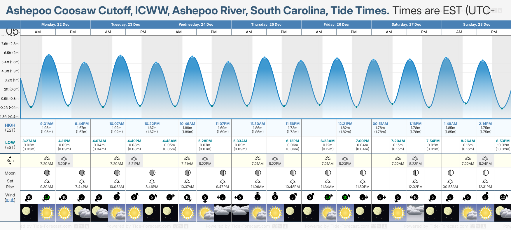 Tide chart for Ashepoo Coosaw Cutoff, ICWW, Ashepoo RiverShowing low and high tide times for the next 30 days at Ashepoo Coosaw Cutoff, ICWW, Ashepoo River. Tide Times are EST (UTC -5.0hrs).