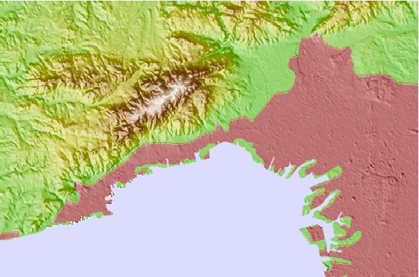 Use this relief map to navigate to tide stations, surf breaks and cities that are in the area of Ashiya.