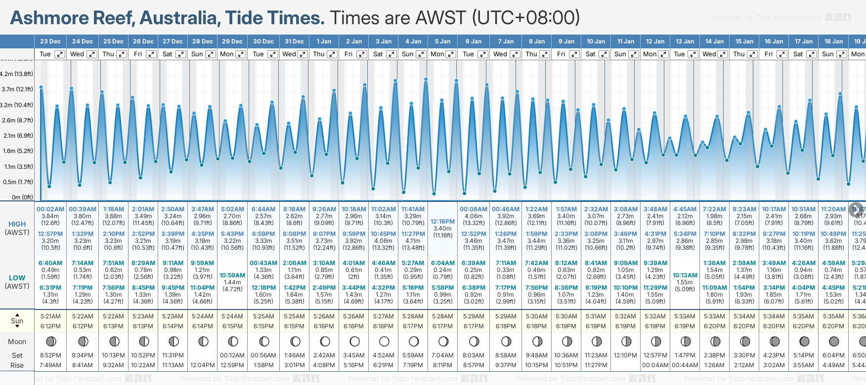 December and January Tide charts for Ashmore Reef: The tide charts below show the height, time and date of high and low tides for the next 30 days.