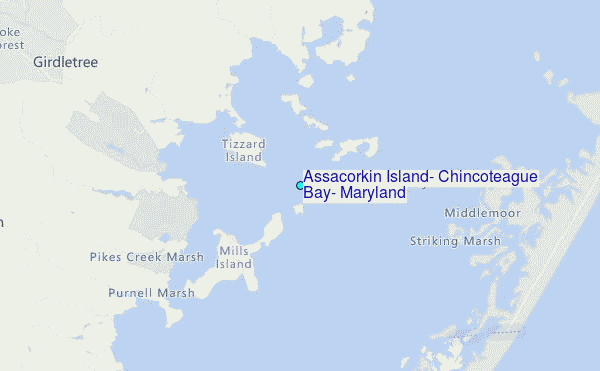 Use this relief map to navigate to tide stations, surf breaks and cities that are in the area of Assacorkin Island, Chincoteague Bay, Maryland.