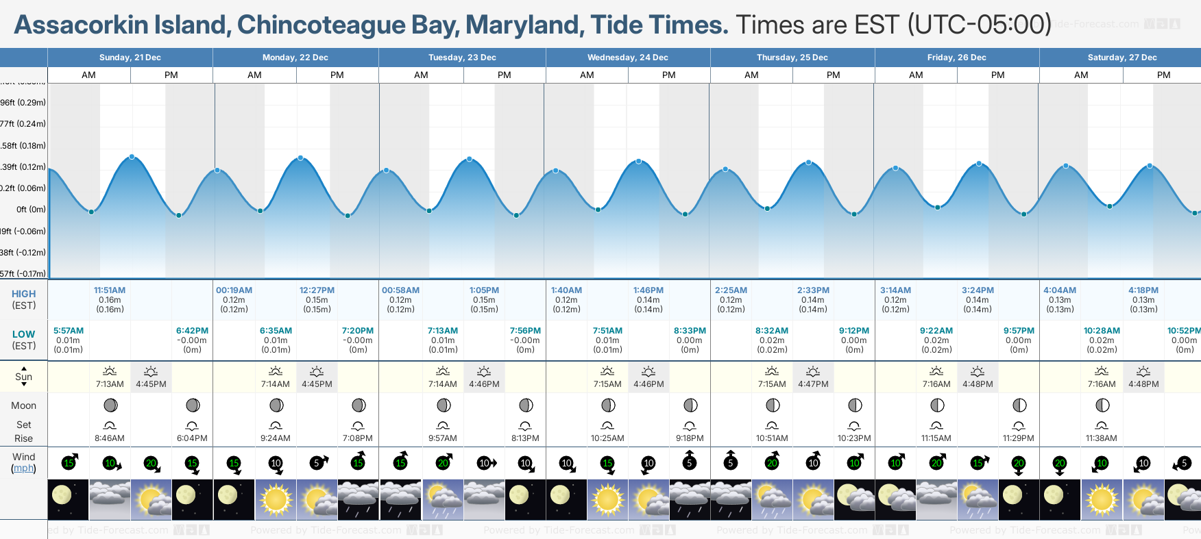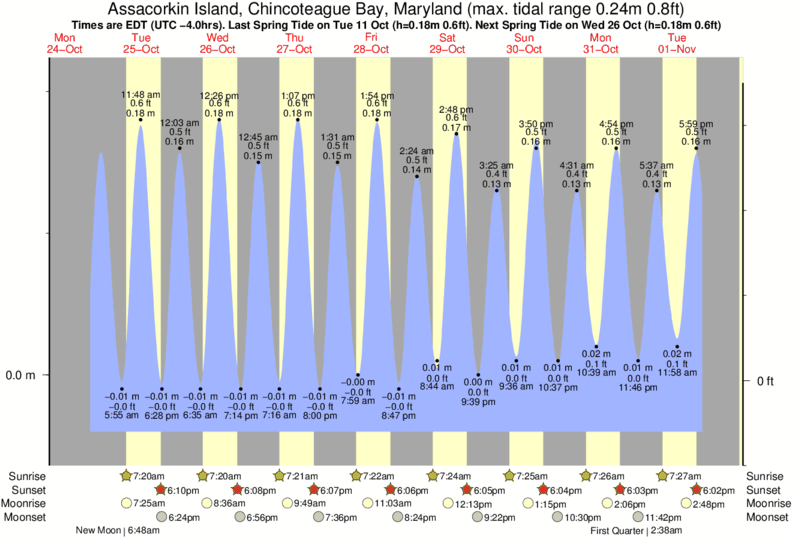 Tide Times are EST (UTC -5.0hrs). Last Spring High Tide at Assacorkin Island, Chincoteague Bay was on Sat 20 Dec (height: 0.16m 0.5ft). Next high Spring Tide at Assacorkin Island, Chincoteague Bay will be on Fri 26 Dec (height: 0.14m 0.5ft).