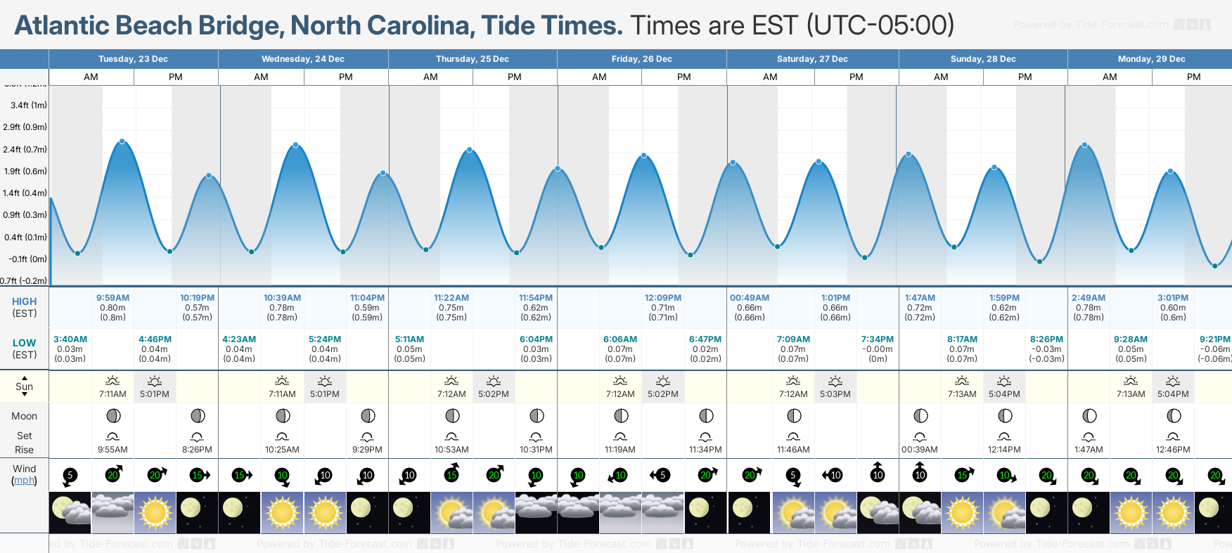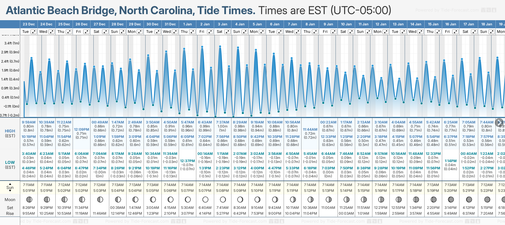 December and January Tide charts for Atlantic Beach Bridge: The tide charts below show the height, time and date of high and low tides for the next 30 days.