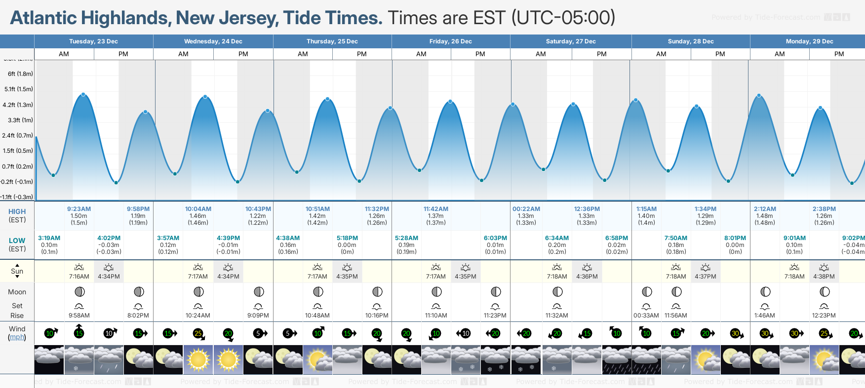 Tide chart for Atlantic HighlandsShowing low and high tide times for the next 30 days at Atlantic Highlands. Tide Times are EST (UTC -5.0hrs).
