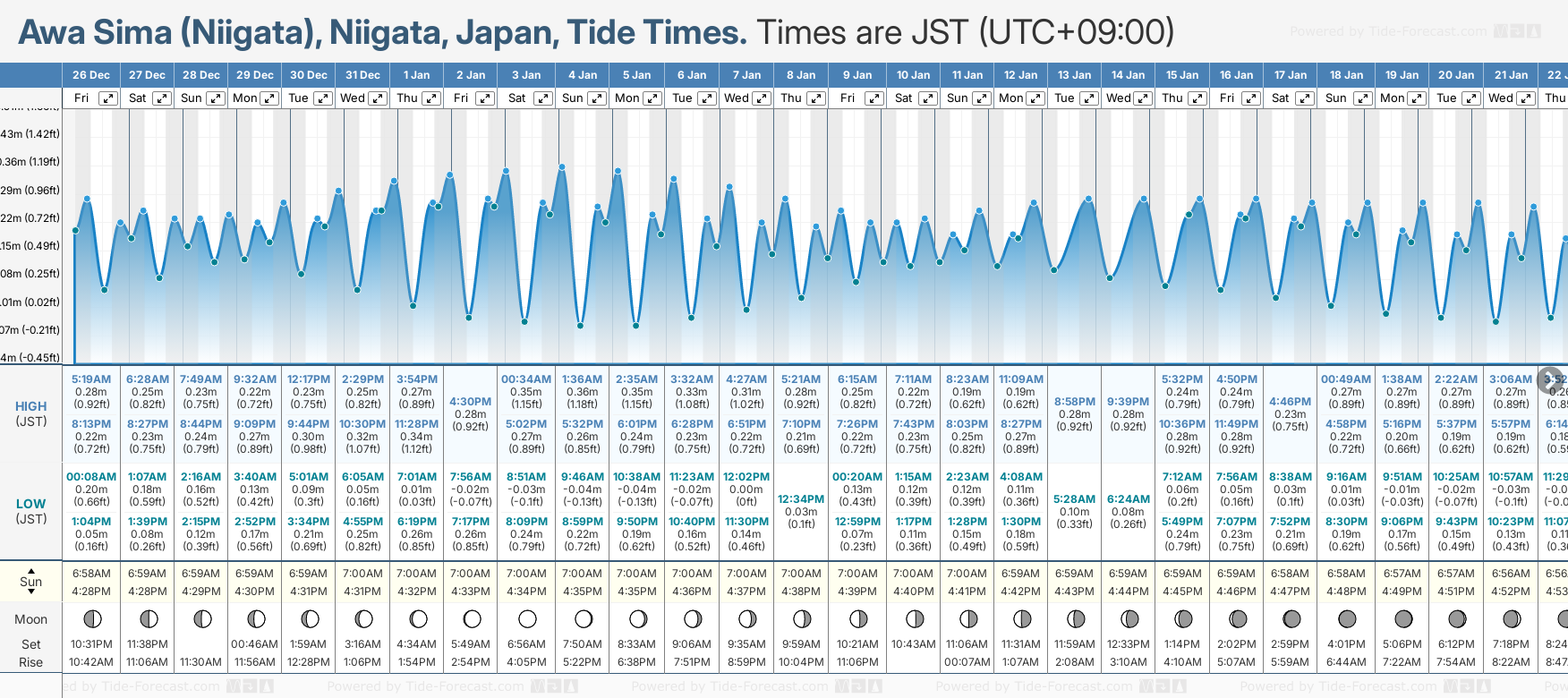 December and January Tide charts for Awa Sima (Niigata): The tide charts below show the height, time and date of high and low tides for the next 30 days.