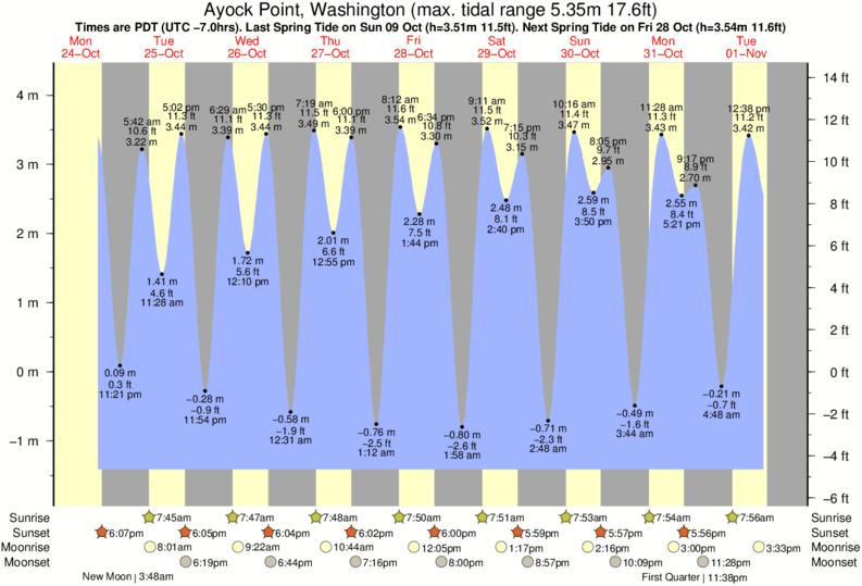 Tide Times are PST (UTC -8.0hrs). Last Spring High Tide at Ayock Point was on Sat 06 Dec (height: 3.89m 12.8ft). Next high Spring Tide at Ayock Point will be on Fri 26 Dec (height: 3.76m 12.3ft).