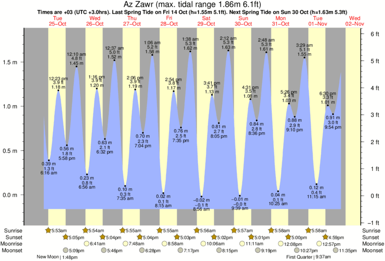 Tide Times are +03 (UTC +3.0hrs). Last Spring High Tide at Az Zawr was on Mon 08 Dec (height: 1.70m 5.6ft). Next high Spring Tide at Az Zawr will be on Tue 23 Dec (height: 1.60m 5.2ft).
