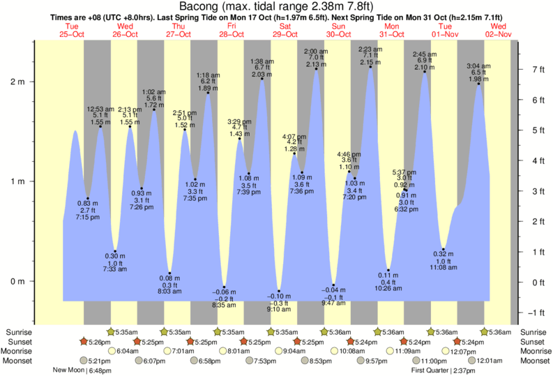 Tide Times are PST (UTC +8.0hrs). Last Spring High Tide at Bacong was on Mon 08 Dec (height: 2.12m 7.0ft). Next high Spring Tide at Bacong will be on Wed 24 Dec (height: 1.93m 6.3ft).