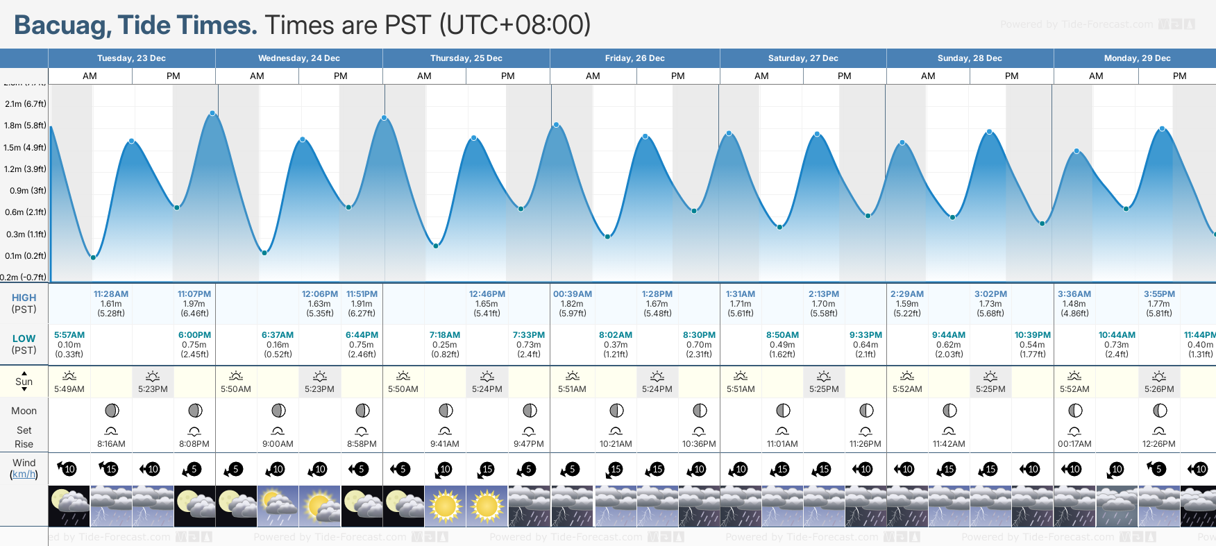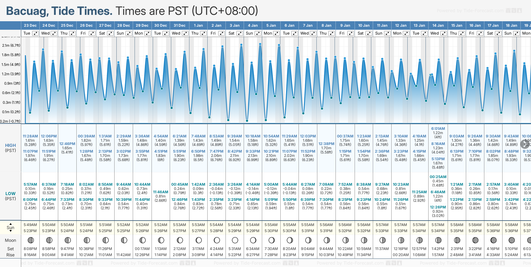 December and January Tide charts for Bacuag: The tide charts below show the height, time and date of high and low tides for the next 30 days.